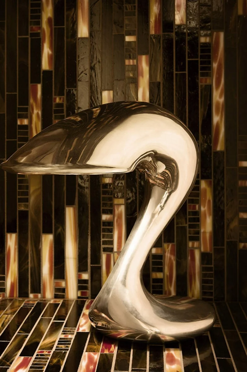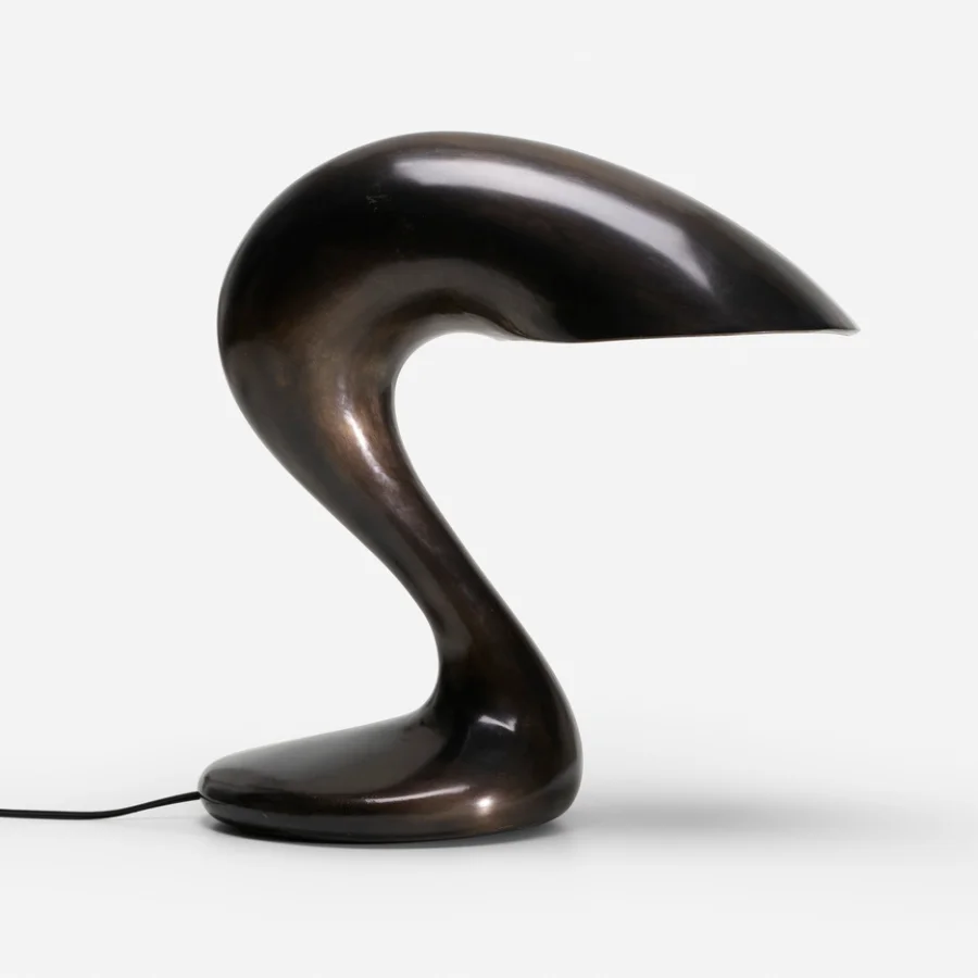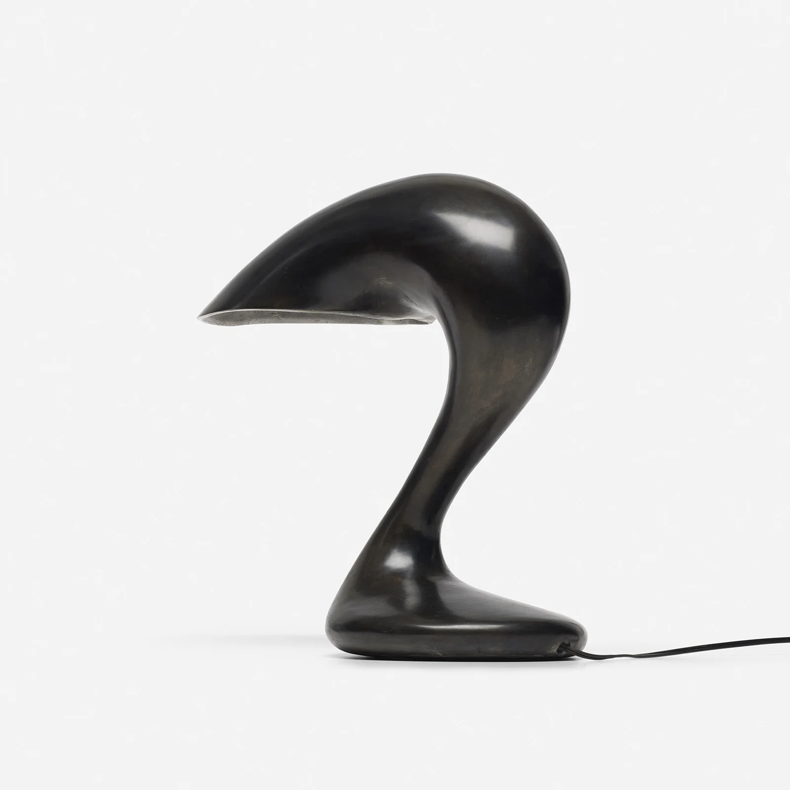 This lamp is a variation of the Question Mark lamp series inspired by the questions of the artist's daughter.Made in Chicago, 1994. Cast recycled magnesium-aluminum, hand polished with dark hand rubbed acid patina.