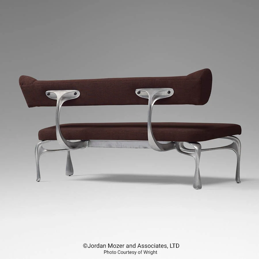 Made in Chicago, 2013. The hand-carved sculptures for the legs and back bracket were scanned in three dimensions, manipulated digitally and then translated into molds used to cast recycled aluminum-magnesium alloy for the exoskeleton of the Victory Love Seat.