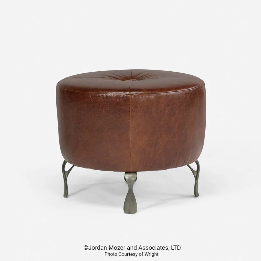 Made in Chicago, 2013. The hand-carved sculptures for the legs were scanned in three dimensions, manipulated digitally and then translated into molds used to cast recycled aluminum-magnesium alloy for the exoskeleton of the Victory Ottoman. The metals were rubbed with acid to create a dark patina. The stool was upholstered in leather in a prototypical form.