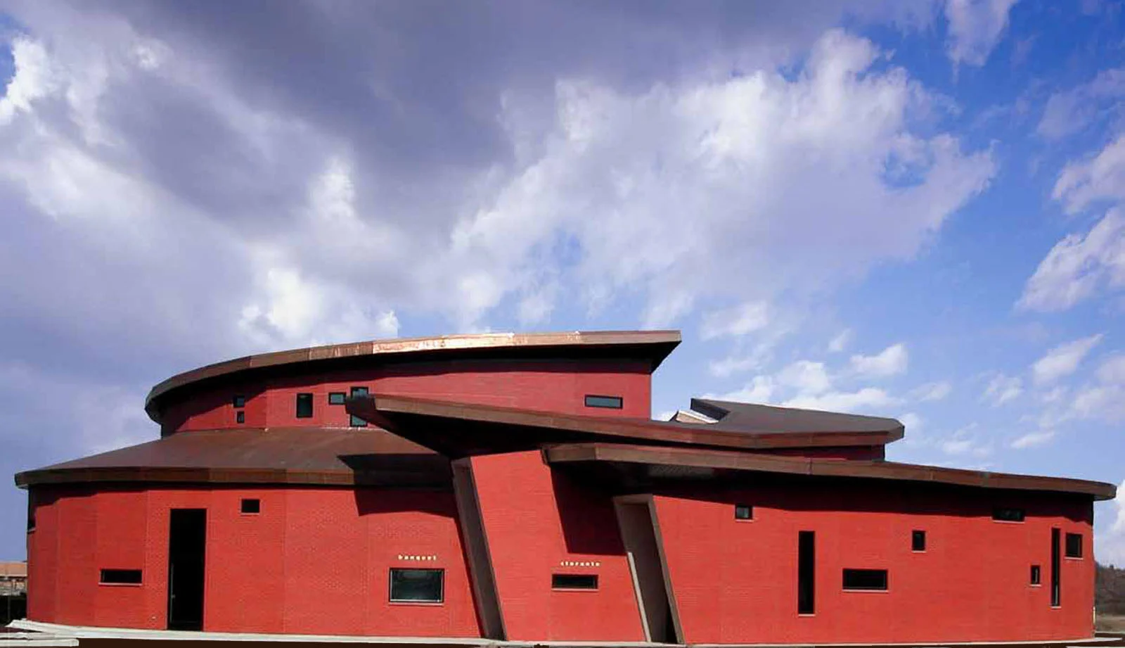 Gamba Ristorante is a new building of 10,000 square foot housing a restaurant and event space located on an acre of land twenty minutes from the Chicago city center. The restaurant is composed of four small buildings, each with their own function: an 80 seat dining room, a 200 seat event space, a bar and a kitchen. All four buildings spiral around an interior courtyard, the building’s piazza. The curving facade creates a three dimensional sign from the street. The architecture employs brick walls, copper roofs, oak floors, Douglas fir beams and ceiling decking. Total development cost without land were $3,100,000. This includes construction, landscape, paving, signs, kitchen, and bar equip, furnishings, fixtures, etc.