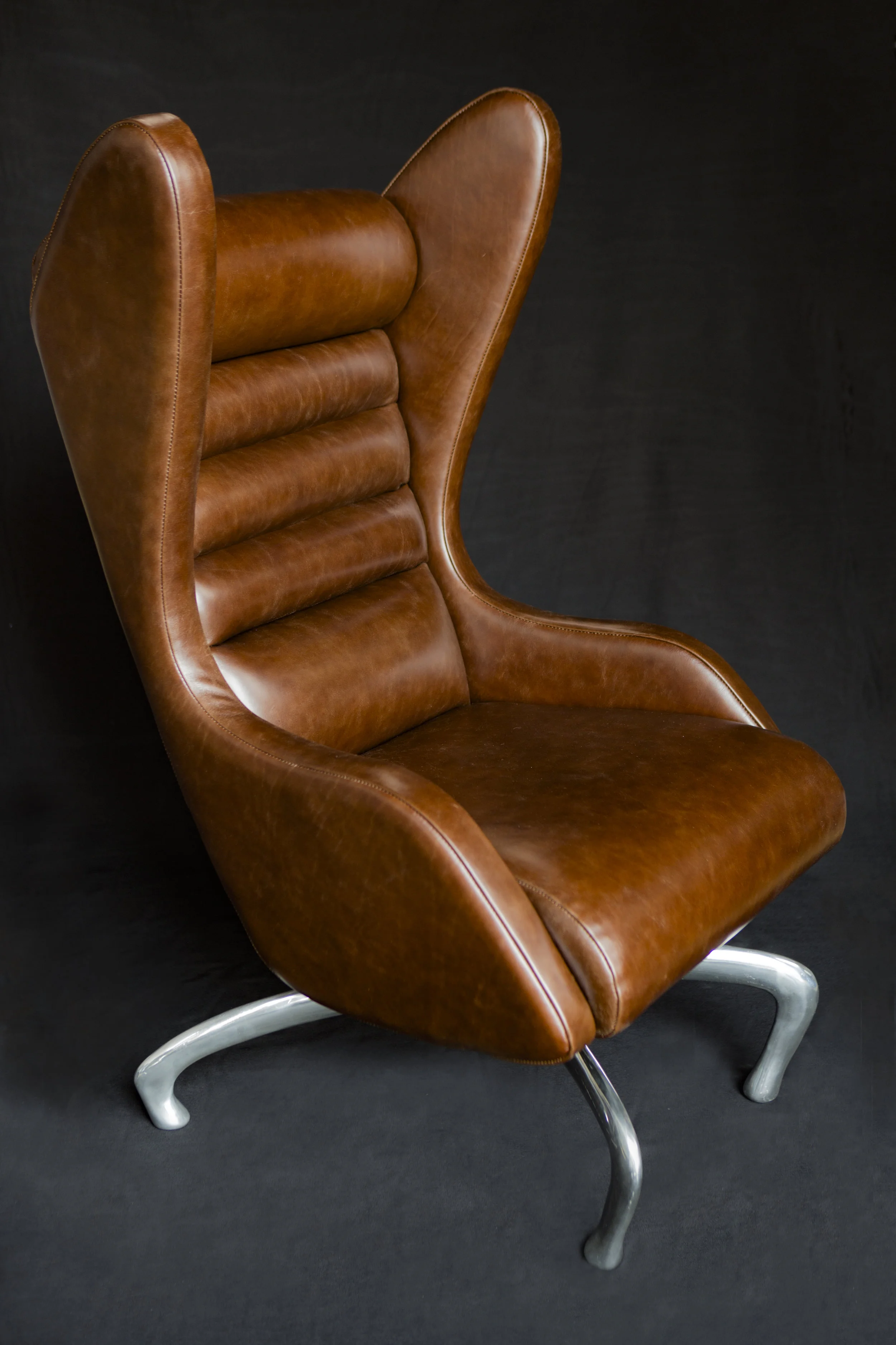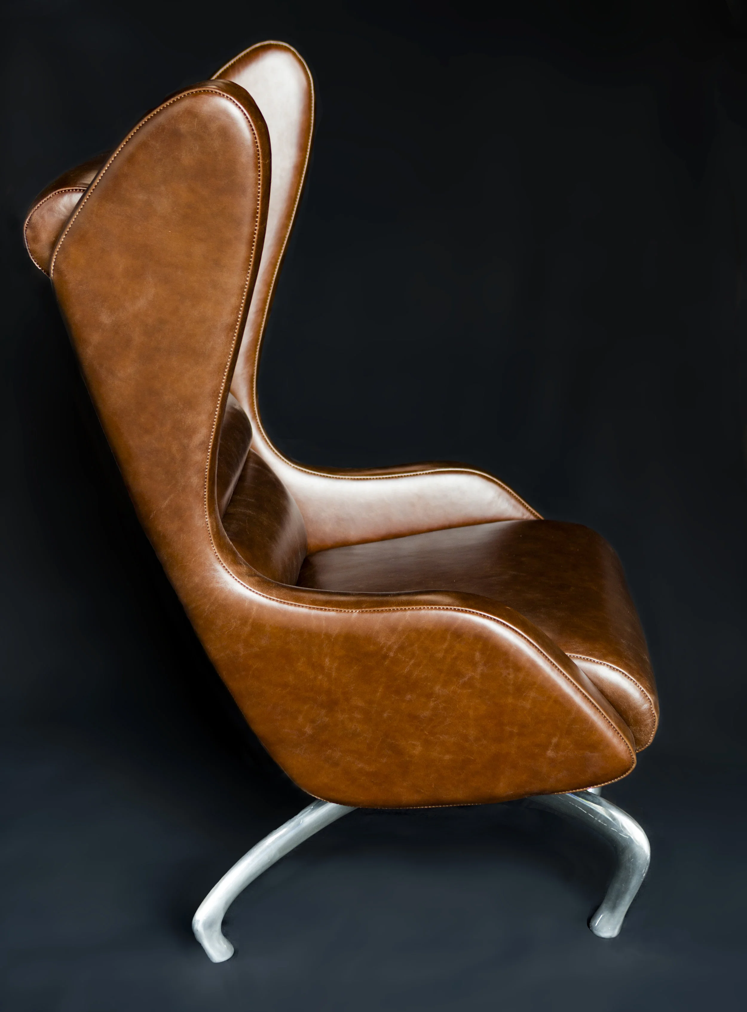 Wood hand carvings were cast in recycled magnesium-aluminum alloy, hand polished, and then patinated by rubbing the castings with elixirs. Photos illustrate variations upholstered in 100% wool flannel and leather. Made in Chicago.
