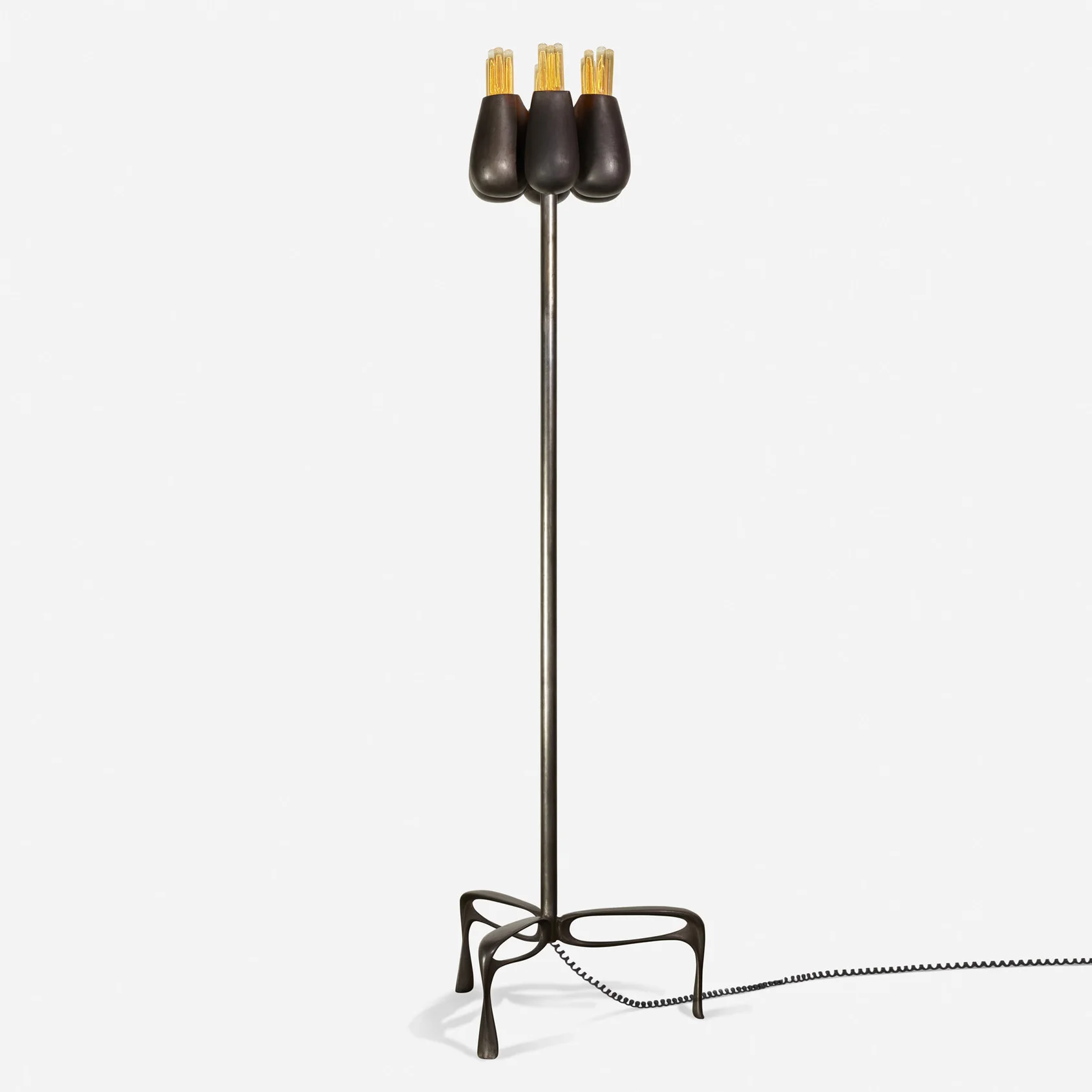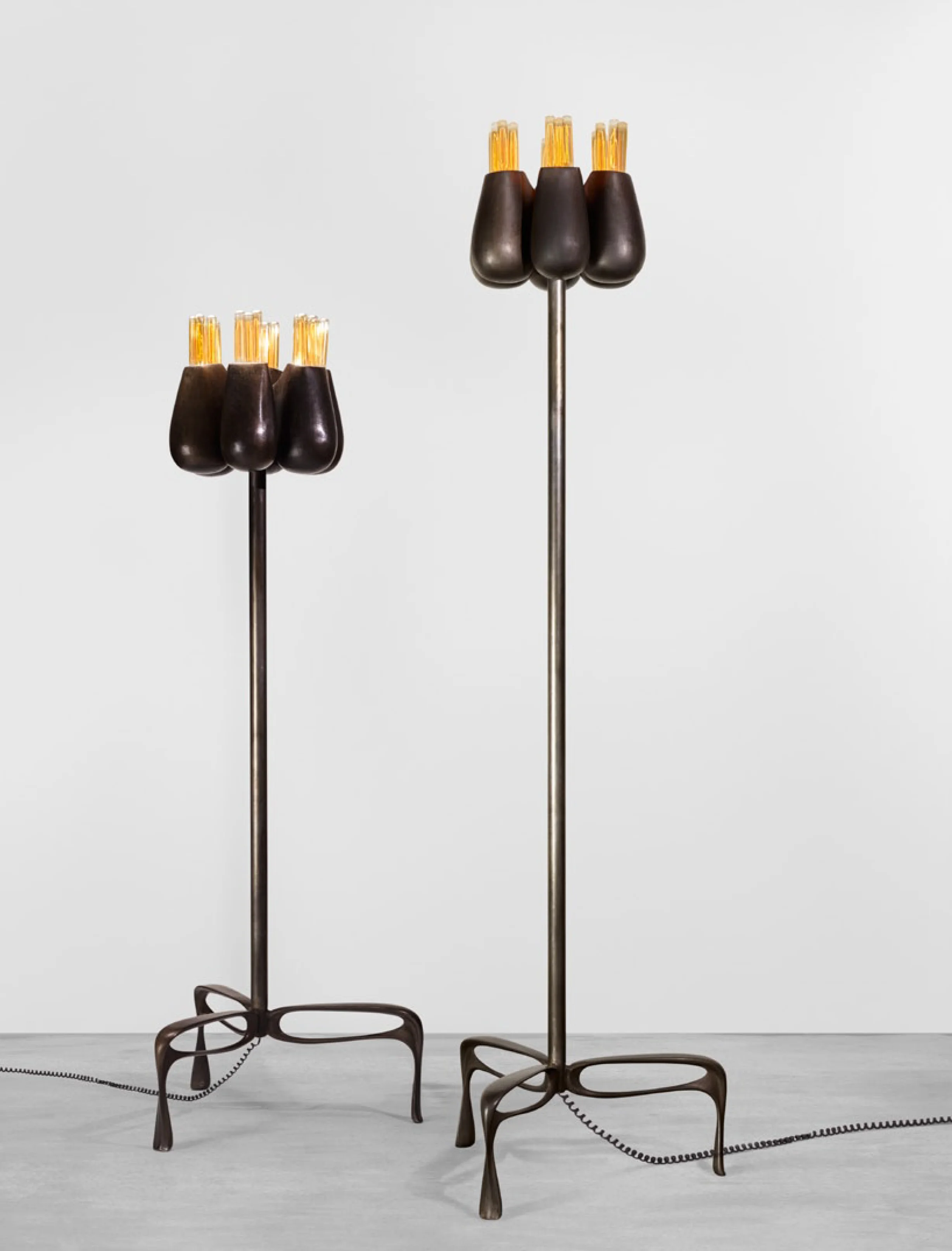 The legs and lamp pod were created using a combination of hand carving, 3-D scanning and inverted 3-D printing. These elements were then cast in recycled magnesium-aluminum, burnished, acid-rubbed and then welded.