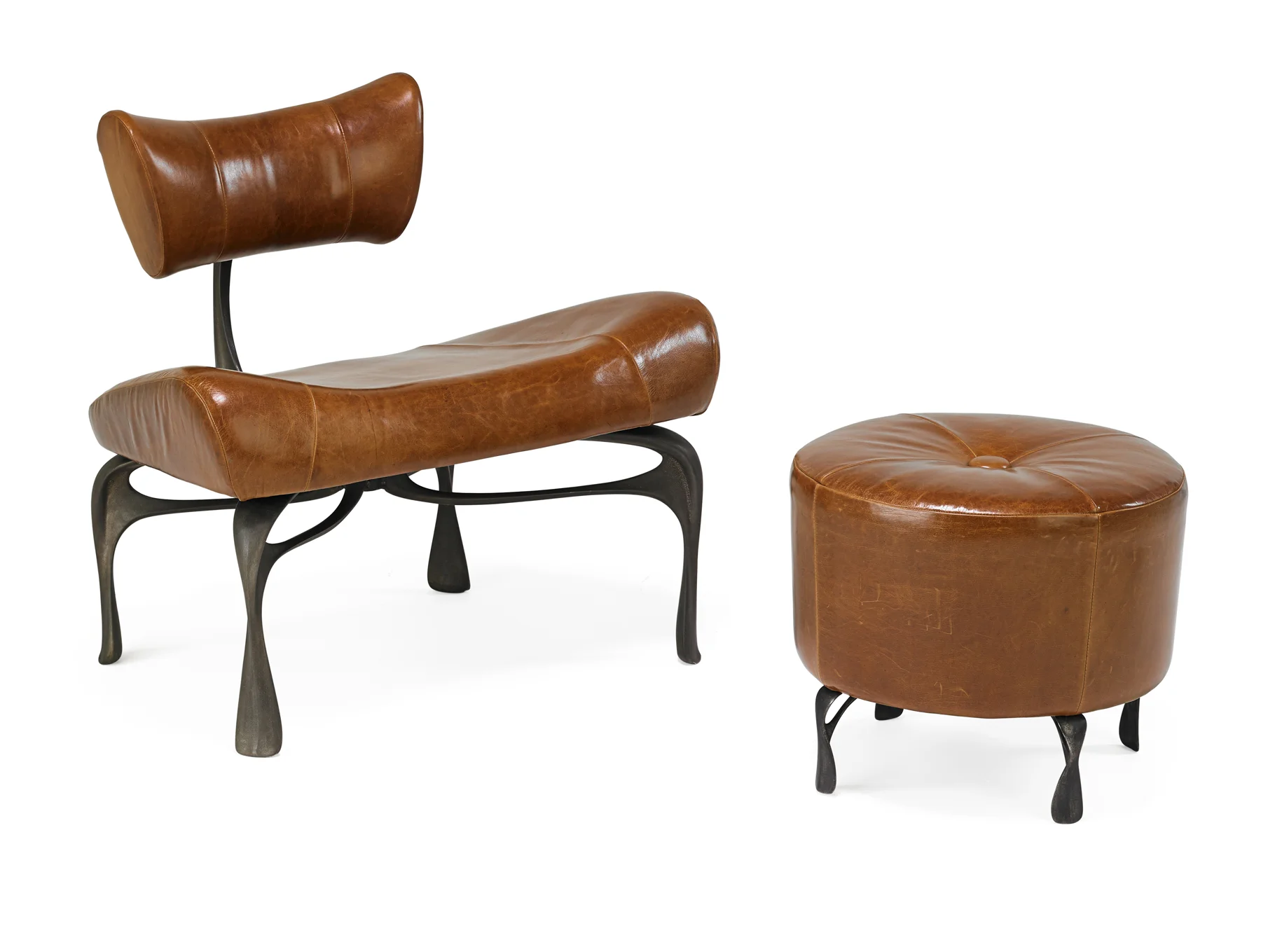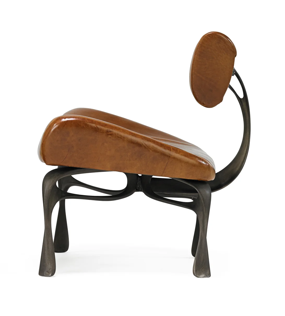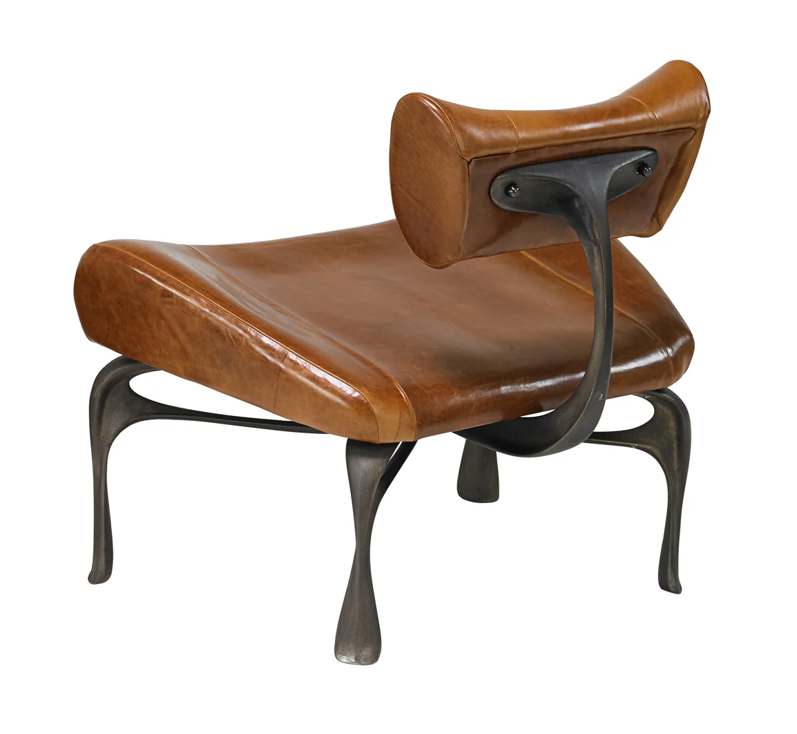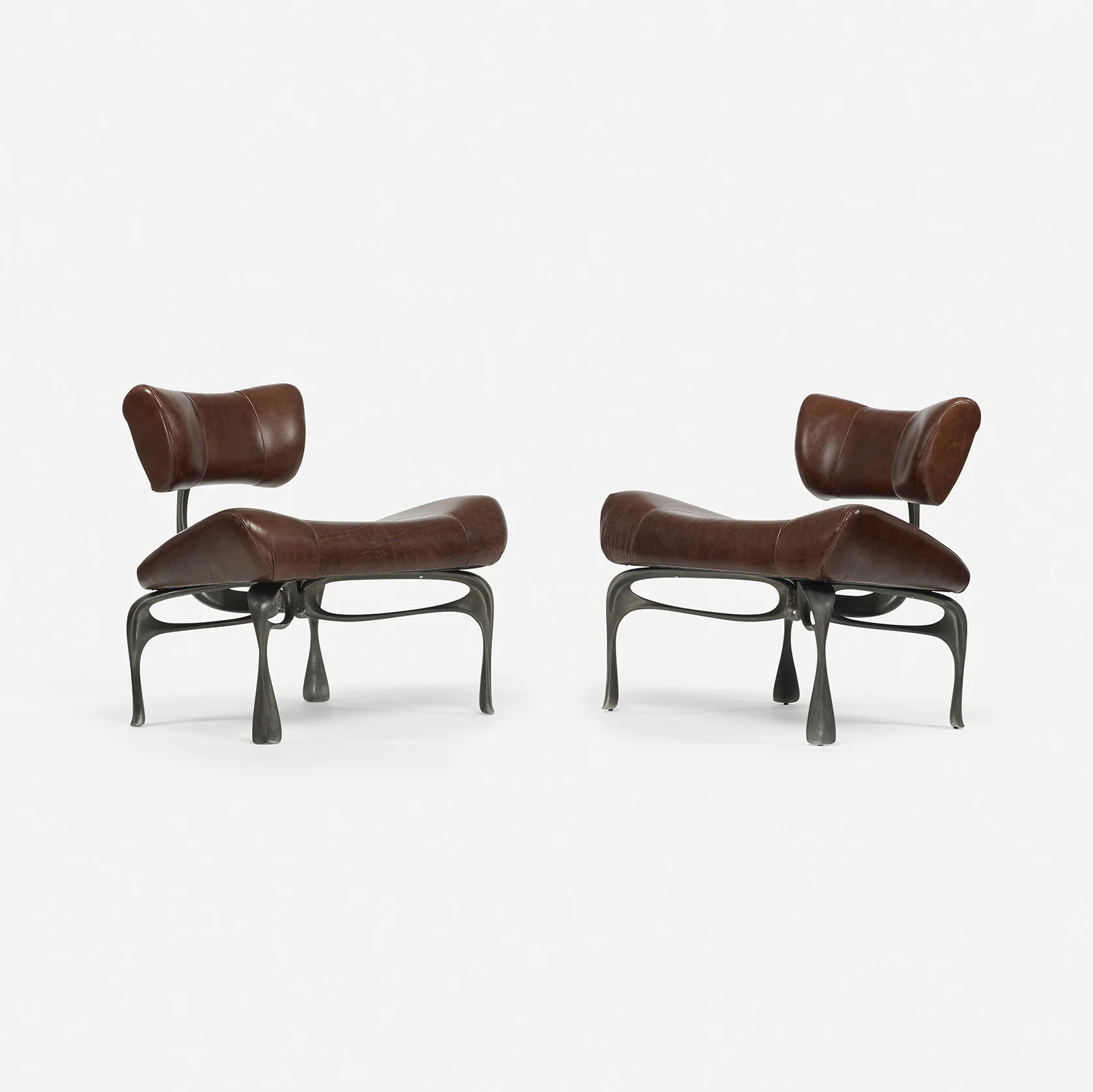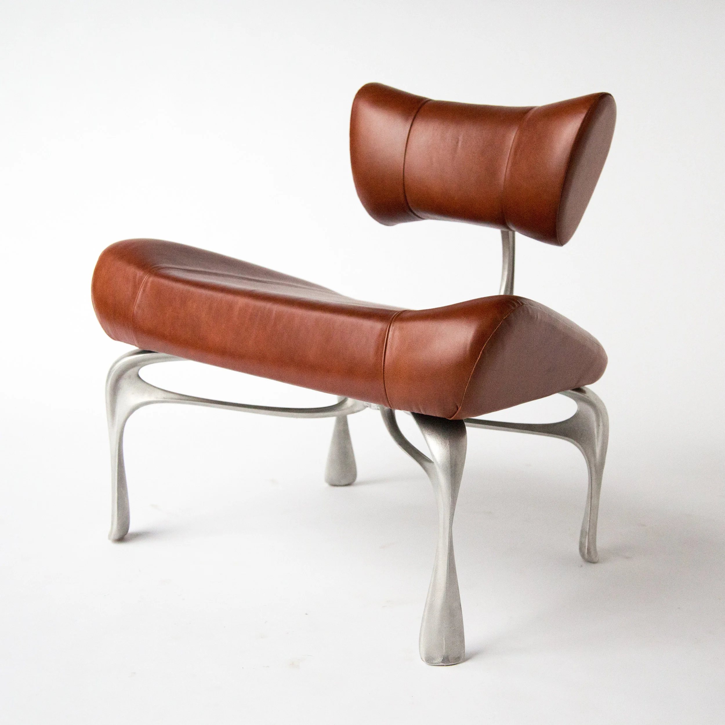 Hand-carved sculptures describing the legs and back bracket were manipulated digitally and then translated into molds used to cast 92% recycled aluminum-magnesium alloy into the exoskeleton of the chairs. The metals were burnished and hand-rubbed with acid to create a dark patina. Leather upholstery. Made in Chicago.